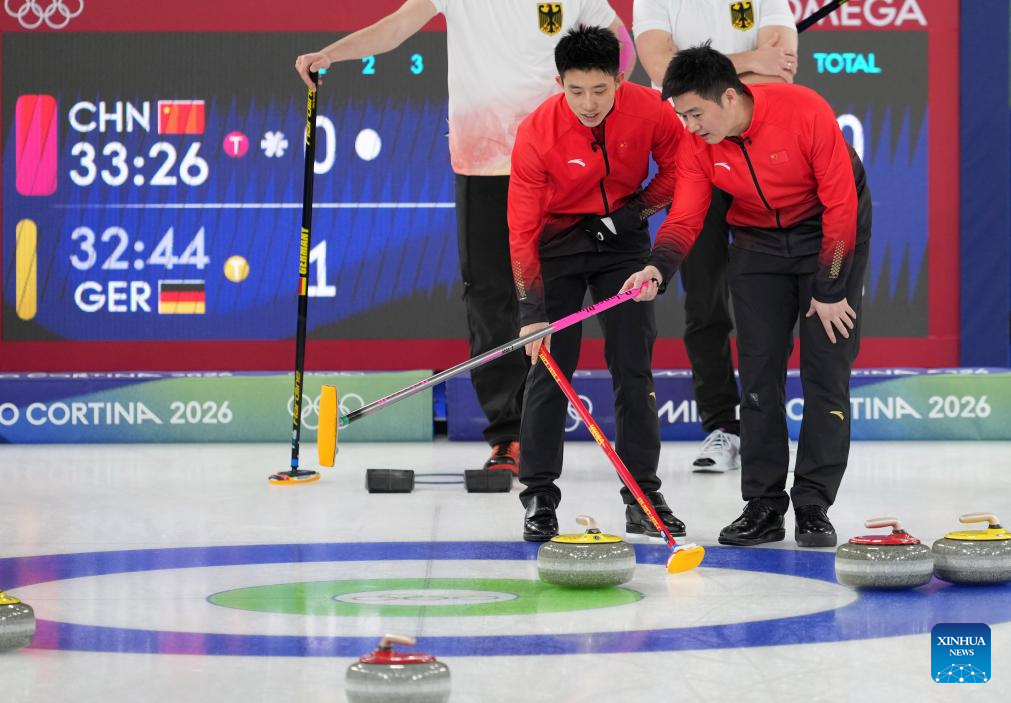 Xu Xiaoming (R) and Fei Xueqing of China communicates during the curling men's round robin session 12 match between China and Germany at the 2026 Milan-Cortina Winter Olympics in Cortina, Italy, Feb. 19, 2026. (Xinhua/Li Gang)