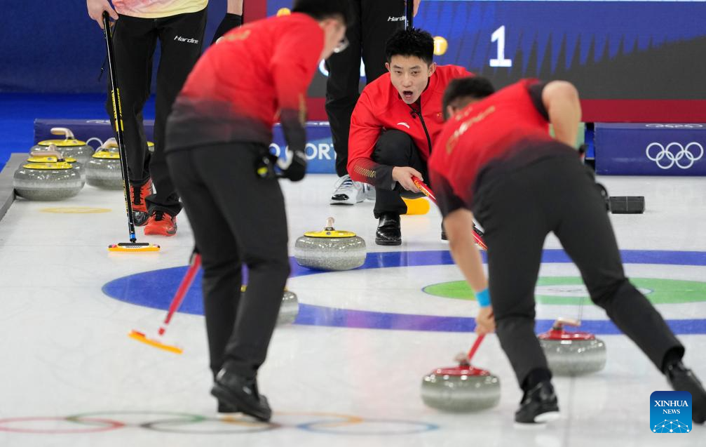 Fei Xueqing (C) of China competes during the curling men's round robin session 12 match between China and Germany at the 2026 Milan-Cortina Winter Olympics in Cortina, Italy, Feb. 19, 2026. (Xinhua/Li Gang)