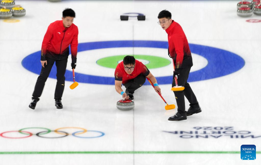 Fei Xueqing, Li Zhichao and Xu Jingtao (L-R) of China compete during the curling men's round robin session 12 match between China and Germany at the 2026 Milan-Cortina Winter Olympics in Cortina, Italy, Feb. 19, 2026. (Xinhua/Li Gang)