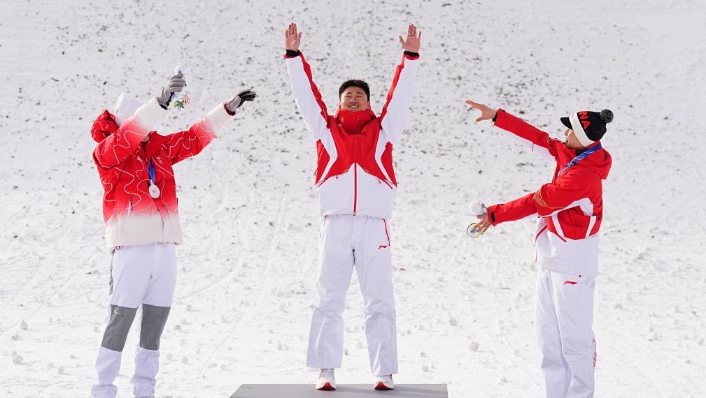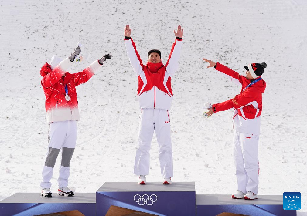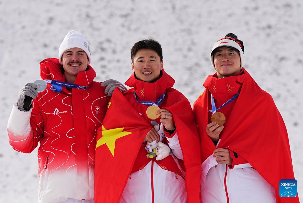 Gold medalist Wang Xindi (C) of China reacts during the awarding ceremony of the freestyle skiing men's aerials at the Milan-Cortina 2026 Olympic Winter Games in Livigno, Italy, Feb. 20, 2026. [Photo/Xinhua]