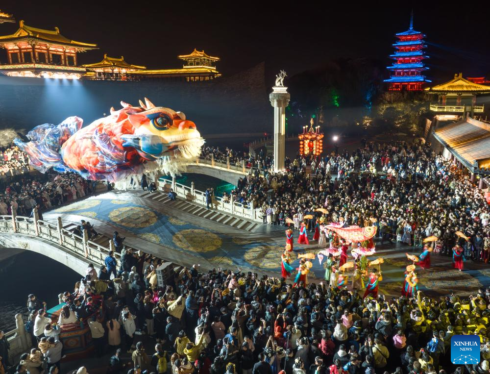 An aerial drone photo shows tourists watching a performance at a scenic area in Xiangyang City, central China's Hubei Province, Feb. 19, 2026. China's Ministry of Culture and Tourism launched a month-long cultural and tourism campaign ahead of the Spring Festival, featuring a wide range of activities and promotional measures to better meet people's needs.