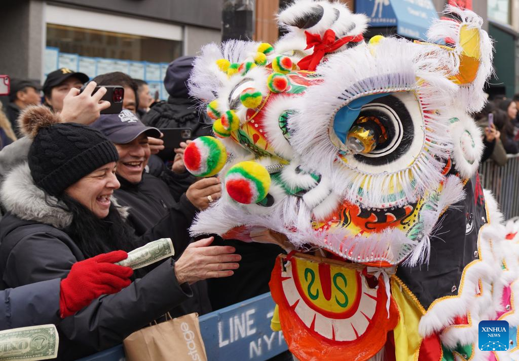 People watch a lion dance during a Chinese New Year parade in New York, the United States, Feb. 21, 2026. A parade was held here to celebrate the Chinese New Year on Saturday. [Photo/Xinhua]