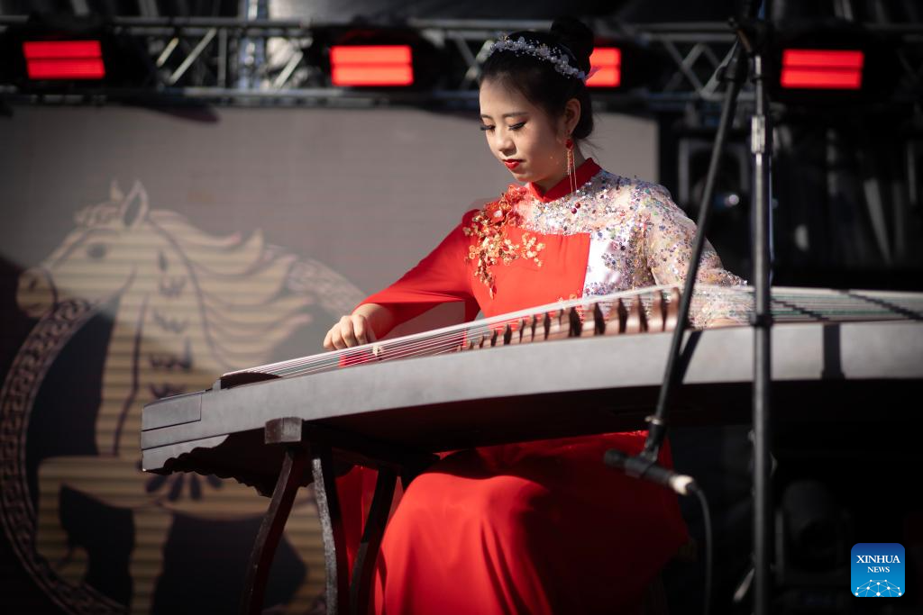 A woman performs traditional Chinese music during a Chinese New Year celebration event in La Plata, Buenos Aires, Argentina, Feb. 21, 2026. A series of activities to celebrate the Chinese New Year were held here on Saturday, attracting large numbers of local residents. [Photo/Xinhua]