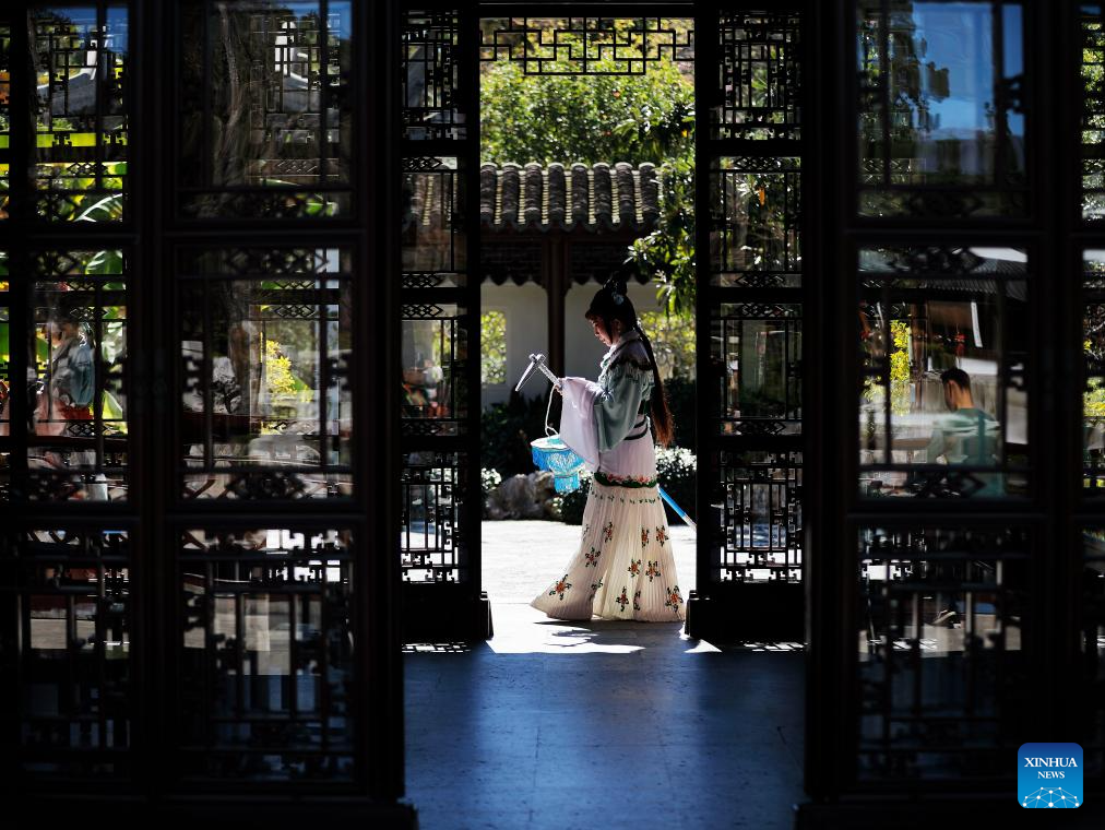 A visitor in Chinese traditional costume is seen at the Huntington Library, Art Museum, and Botanical Gardens in San Marino, Los Angeles County, California, the United States, on Feb. 21, 2026. The Chinese New Year was celebrated at the Huntington Library with arts and crafts, music and a lion dance performance. [Photo/Xinhua]