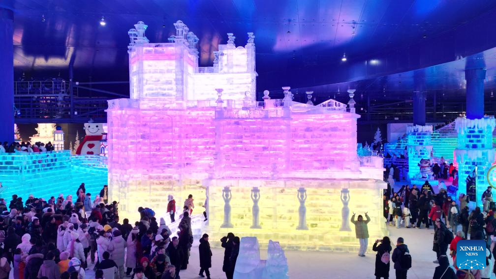 A drone photo taken on Feb. 22, 2026 shows tourists having fun at the indoor ice-and-snow theme park in the Harbin Ice and Snow World in Harbin, northeast China's Heilongjiang Province. The indoor ice-and-snow theme park, a facility located within Harbin Ice-Snow World, opened on Sunday as the outdoor Harbin Ice-Snow World officially closed its 27th edition on Saturday. (Photo by Liu Yang/Xinhua)