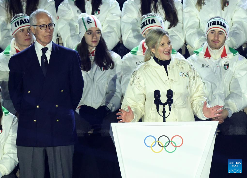 International Olympic Committee (IOC) President Kirsty Coventry addresses the closing ceremony of the Milan-Cortina 2026 Olympic Winter Games at Verona Olympic Arena in Verona, Italy, Feb. 22, 2026. (Xinhua/Li Jing)