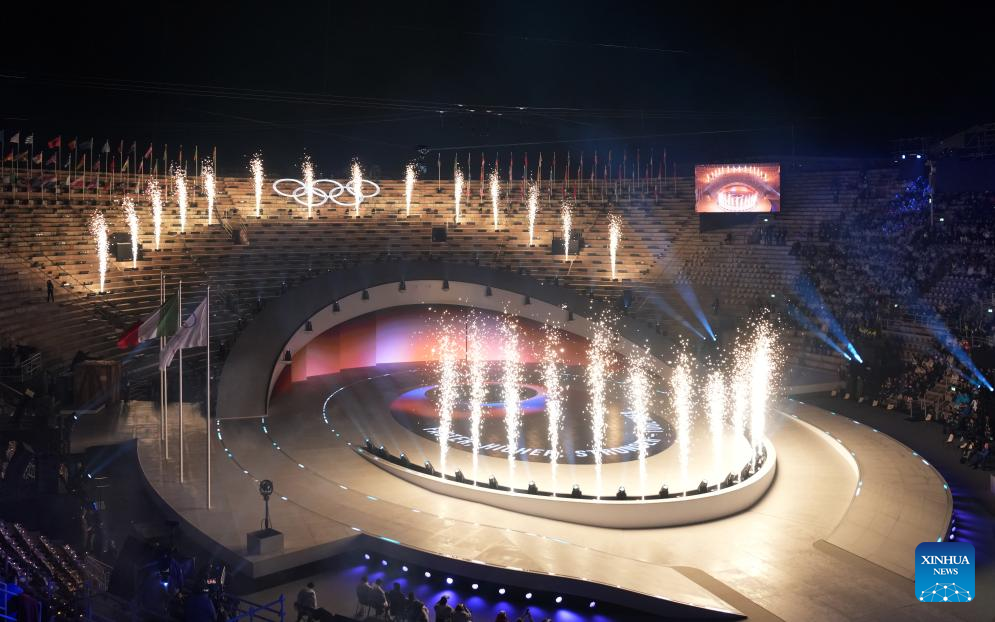 Fireworks is pictured during the closing ceremony of the Milan-Cortina 2026 Olympic Winter Games at Verona Olympic Arena in Verona, Italy, Feb. 22, 2026. (Xinhua/Sun Fei)