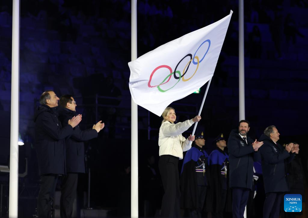 International Olympic Committee (IOC) President Kirsty Coventry waves the Olympic flag during the closing ceremony of the Milan-Cortina 2026 Olympic Winter Games at Verona Olympic Arena in Verona, Italy, Feb. 22, 2026. (Xinhua/Li Ming)