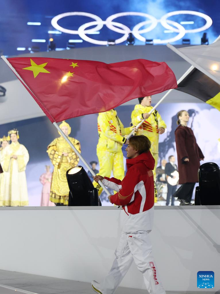 Su Yiming, flag bearer of the delegation of China, parades during the closing ceremony of the Milan-Cortina 2026 Olympic Winter Games at Verona Olympic Arena in Verona, Italy, Feb. 22, 2026. (Xinhua/Li Ming)
