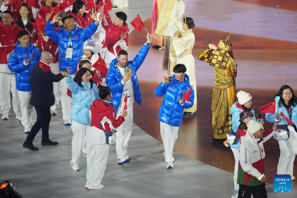 Members of the delegation of China parade during the closing ceremony of the Milan-Cortina 2026 Olympic Winter Games at Verona Olympic Arena in Verona, Italy, Feb. 22, 2026. (Xinhua/Xue Yuge)