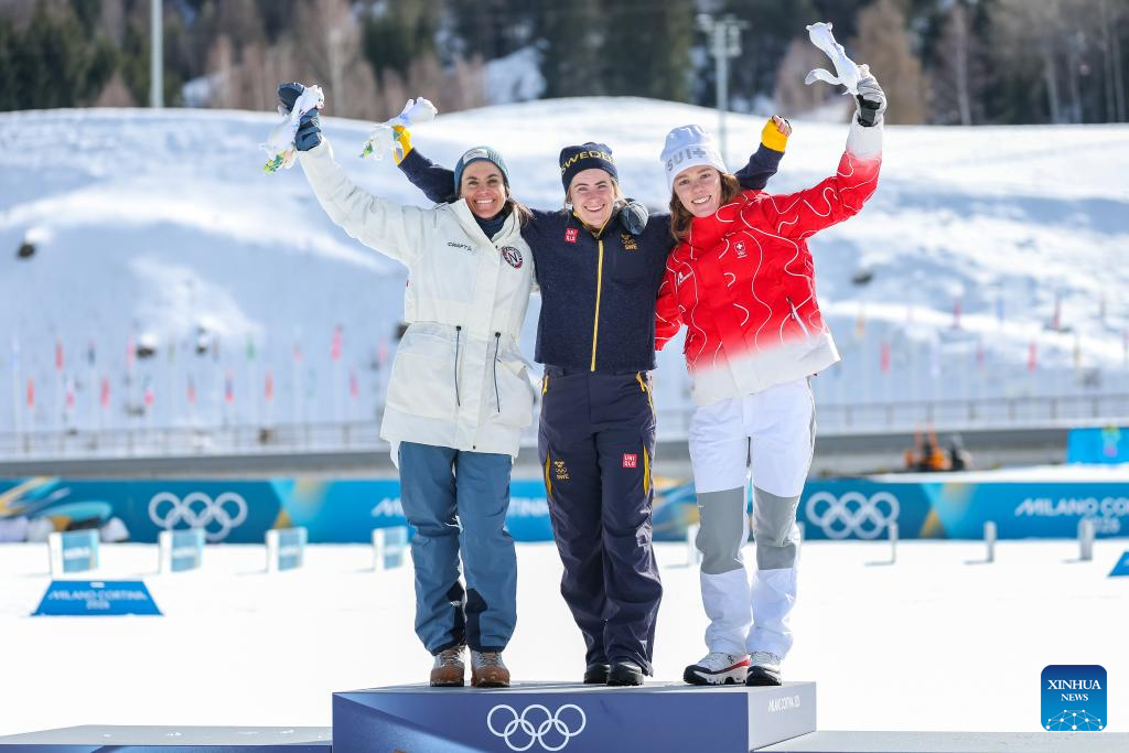 Gold medalist Ebba Andersson (C) of Sweden, silver medalist Heidi Weng (L) of Norway and bronze medalist Nadja Kaelin of Switzerland pose on the podium after the cross-country skiing women's 50km mass start classic match at the Milan-Cortina 2026 Olympic Winter Games in Tesero, Italy, Feb. 22, 2026. [Photo/Xinhua]