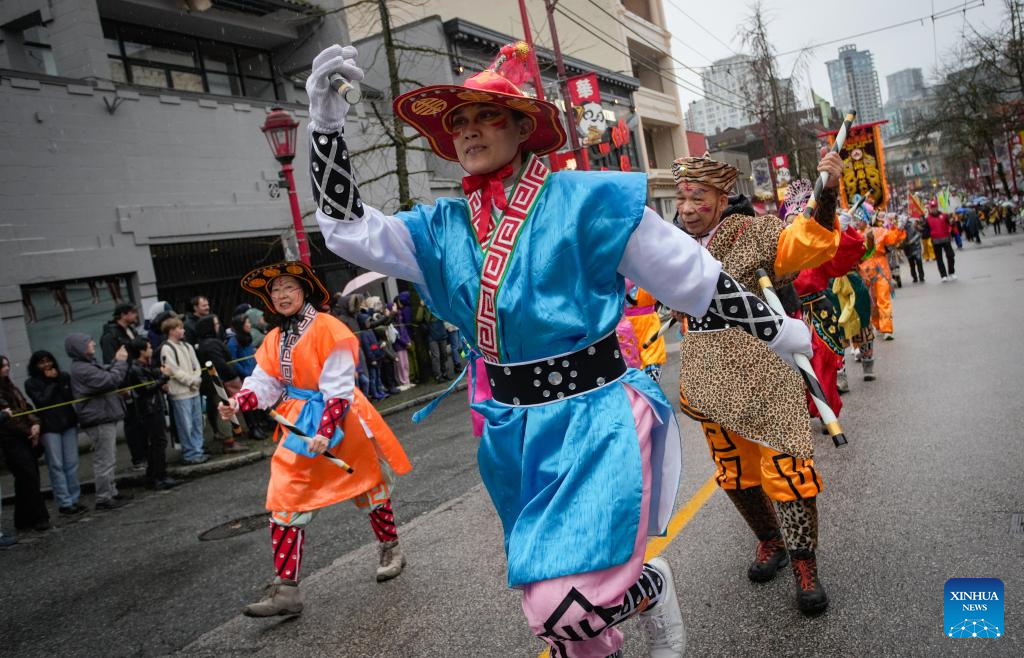 Performers march along the street during a Spring Festival parade at Chinatown in Vancouver, British Columbia, Canada, on Feb. 22, 2026. The 52nd annual Vancouver Chinatown Spring Festival Parade was held here on Sunday to celebrate the Chinese Year of the Horse. (Photo by Liang Sen/ Xinhua)