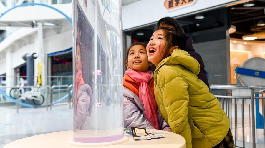 Children experience a scientific experimental device at a science and technology museum in Taizhou, east China's Jiangsu province, on Feb. 6, 2026. [Photo/Xinhua]