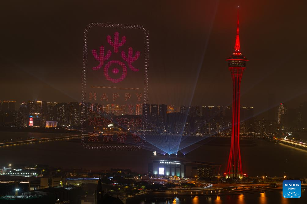 This photo taken on Feb. 23, 2026 shows a drone show above the sea near Macao Tower in Macao, south China. A drone and fireworks show was held on Monday by the Macao Government Tourism Office to celebrate the Spring Festival. (Xinhua/Cheong Kam Ka)