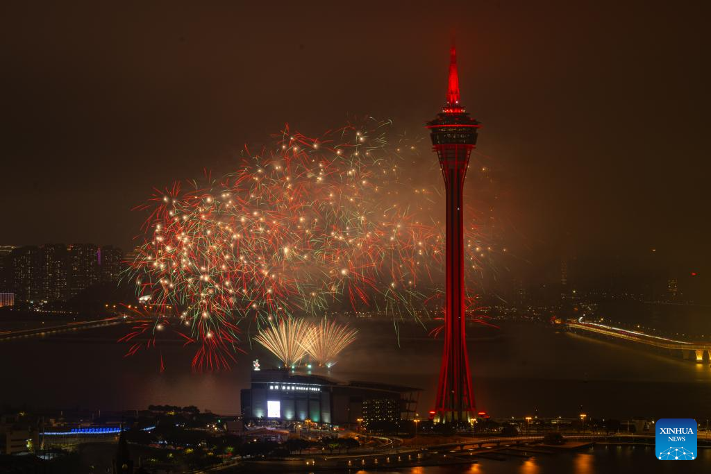 This photo taken on Feb. 23, 2026 shows a fireworks show above the sea near Macao Tower in Macao, south China. A drone and fireworks show was held on Monday by the Macao Government Tourism Office to celebrate the Spring Festival. (Xinhua/Cheong Kam Ka)