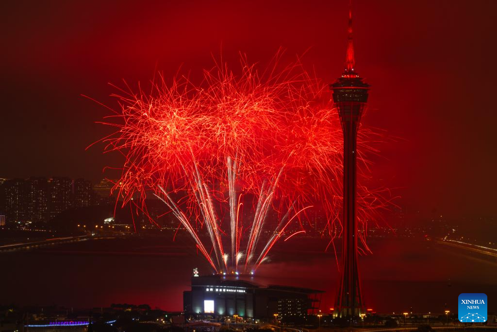 This photo taken on Feb. 23, 2026 shows a fireworks show above the sea near Macao Tower in Macao, south China. A drone and fireworks show was held on Monday by the Macao Government Tourism Office to celebrate the Spring Festival. (Xinhua/Cheong Kam Ka)