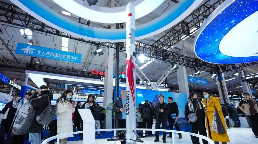 People visit the model of reusable Zhuque-3 rocket at the 2026 Beijing International Commercial Space Exhibition in Beijing, capital of China, Jan. 23, 2026. [Photo/Xinhua]