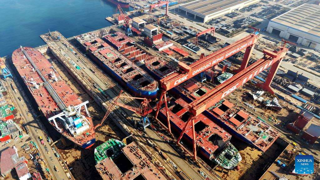 An aerial drone photo taken on Feb. 25, 2026 shows the Haixi Bay Shipbuilding and Marine Engineering Industrial Base in Qingdao, east China's Shandong province. As production resumes after the Spring Festival holiday, factories and enterprises across the country are operating at full steam to meet orders and ramp up output. (Photo by Yu Fangping/Xinhua)