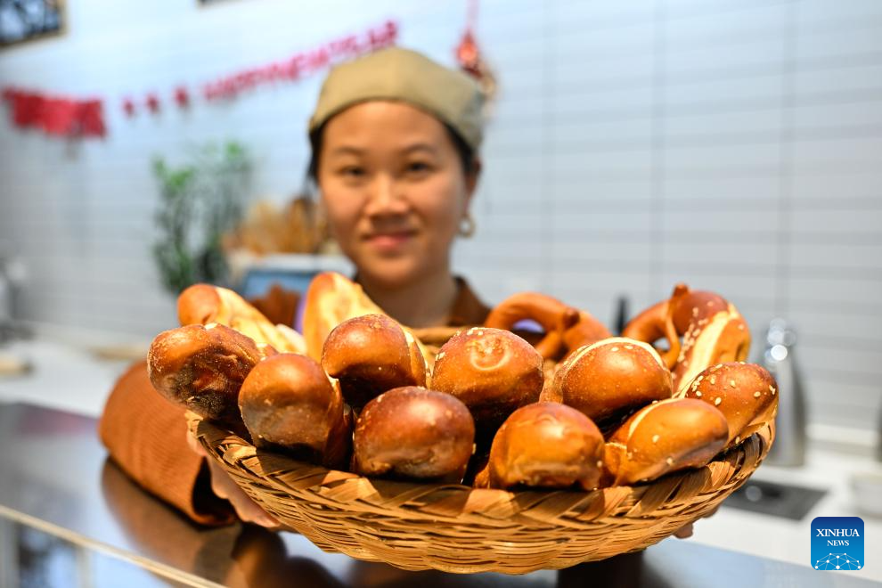 A waitress demonstrates German-style buns at a German bakery in Taicang, east China's Jiangsu Province, Feb. 24, 2026. Taicang, with its permanent resident population of less than one million, is a small city on the south bank of Yangtze River estuary. Known as the "hometown of German enterprises" in China, Taicang has gathered over 560 German-funded enterprises so far since the first German company Kern-Liebers settled here in 1993, with the total investment exceeding six billion U.S. dollars and an annual industrial output value of over 67 billion yuan (about 9.76 billion U.S. dollars). (Xinhua/Ji Chunpeng)