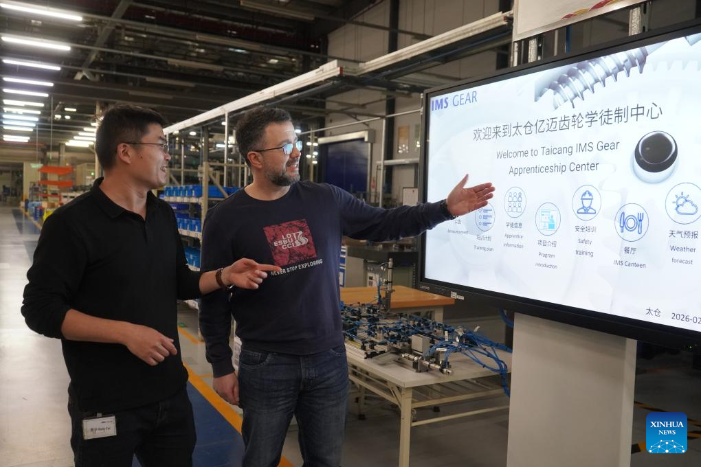 Trainer Thomas Pastore (R) explains dual system training at Taicang IMS Gear in Taicang, east China's Jiangsu Province, Feb. 24, 2026. Taicang, with its permanent resident population of less than one million, is a small city on the south bank of Yangtze River estuary. Known as the "hometown of German enterprises" in China, Taicang has gathered over 560 German-funded enterprises so far since the first German company Kern-Liebers settled here in 1993, with the total investment exceeding six billion U.S. dollars and an annual industrial output value of over 67 billion yuan (about 9.76 billion U.S. dollars). (Photo by Liu Zhenrui/Xinhua)