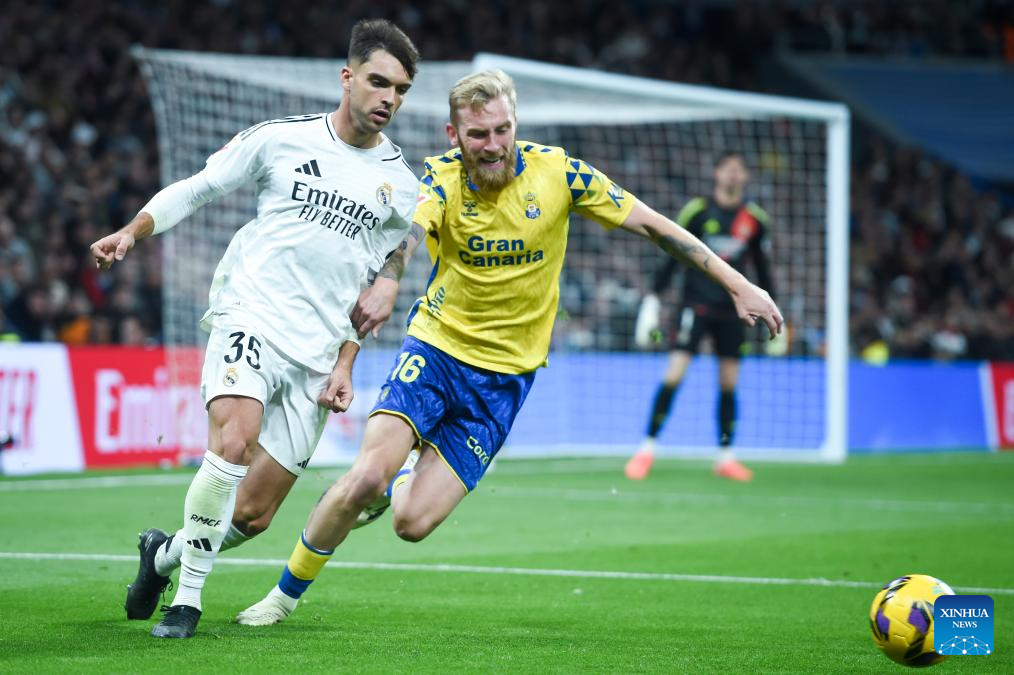 Raul Asencio (L) of Real Madrid vies with Oliver Mcburnie of UD Las Palmas during the LaLiga football match between Real Madrid and UD Las Palmas, at Santiago Bernabeu Stadium, Madrid, Spain, on Jan. 19, 2025. (Photo by Gustavo Valiente/Xinhua)