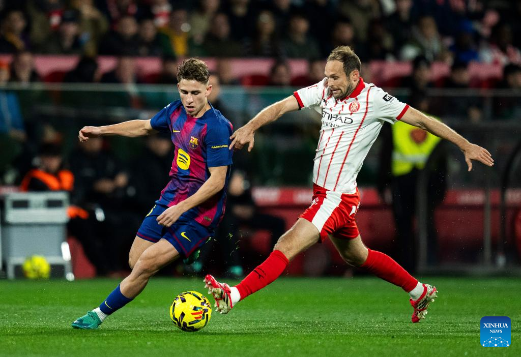 Fermin Lopez (L) of Barcelona vies with Daley Blind of Girona during the La Liga football match between Girona FC and FC Barcelona in Girona, Spain, Feb. 16, 2026. (Photo by Joan Gosa/Xinhua)