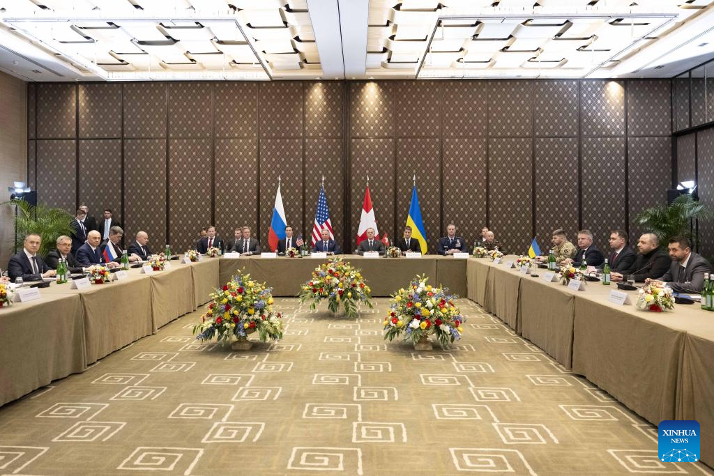 This photo taken on Feb. 17, 2026 shows the scene of trilateral talks among Ukraine, the United States and Russia in Geneva, Switzerland. [Photo/The Swiss Federal Department of Foreign Affairs handout via Xinhua]