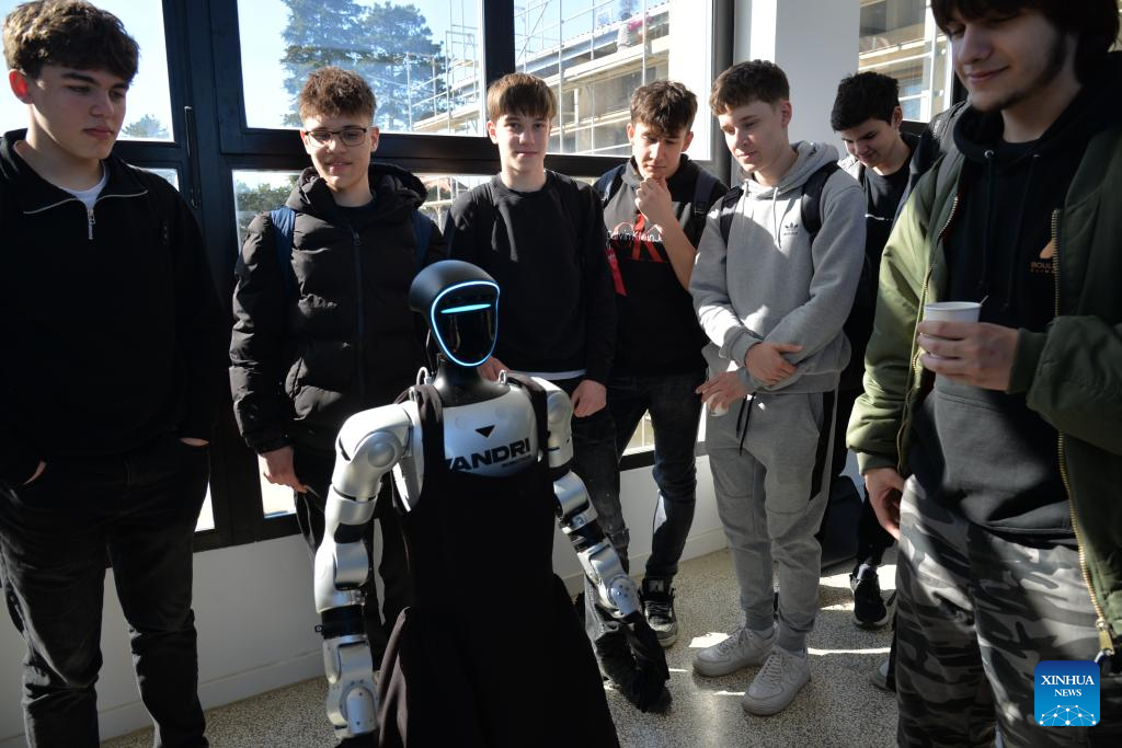 Students view humanoid robot Tonka in Zagreb, Croatia, on Feb. 25, 2026. Humanoid robot Tonka, capable of performing fluid dance routines and Kung Fu-inspired movements, was unveiled on Wednesday at the Rudjer Boskovic Institute during the conference on humanoid robotics. Named Tonka after a popular Croatian female name to reflect local culture, the robot is built on the Unitree G1 platform developed by China's Unitree Robotics. (Xinhua/Ma Zhen)