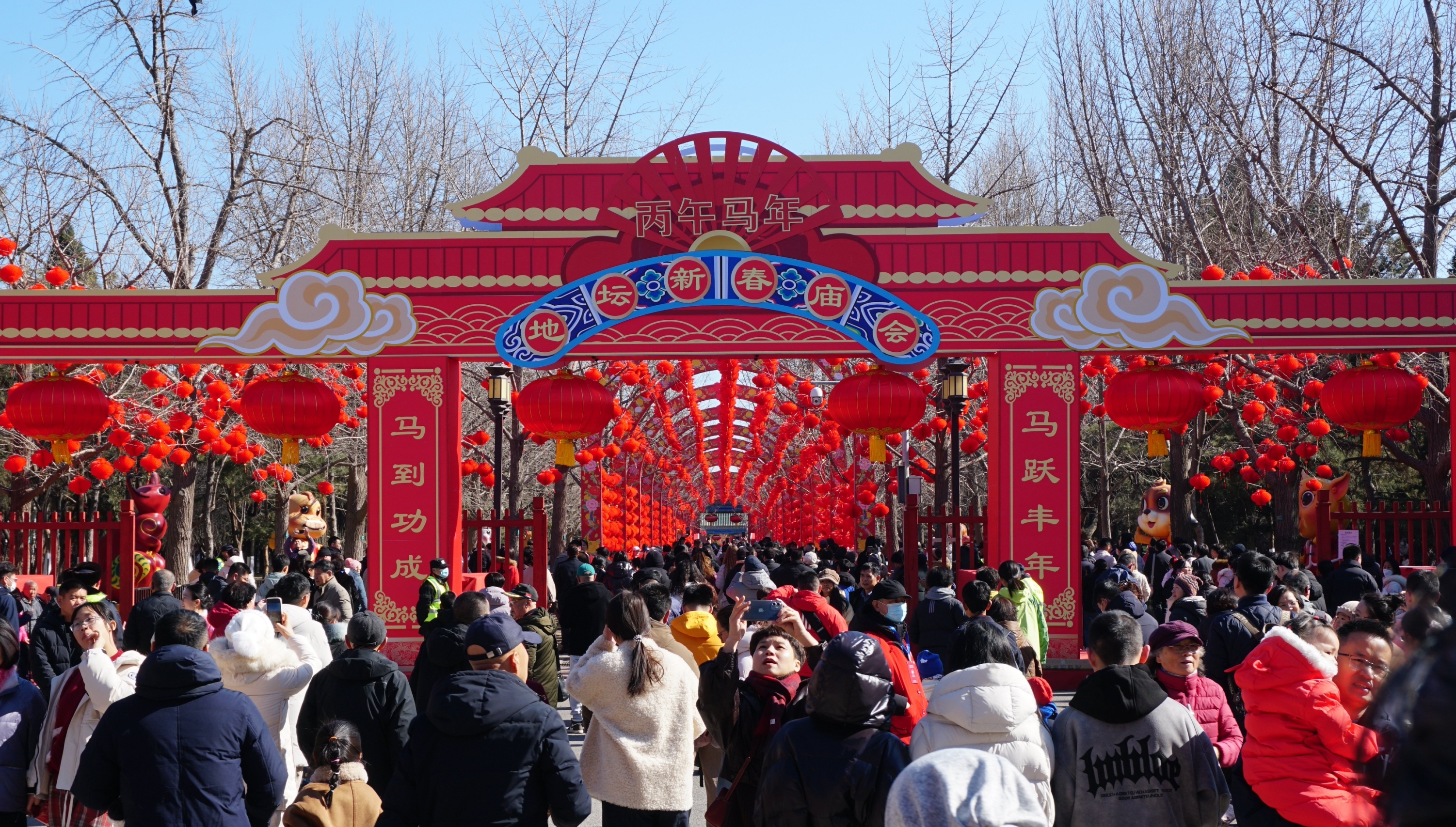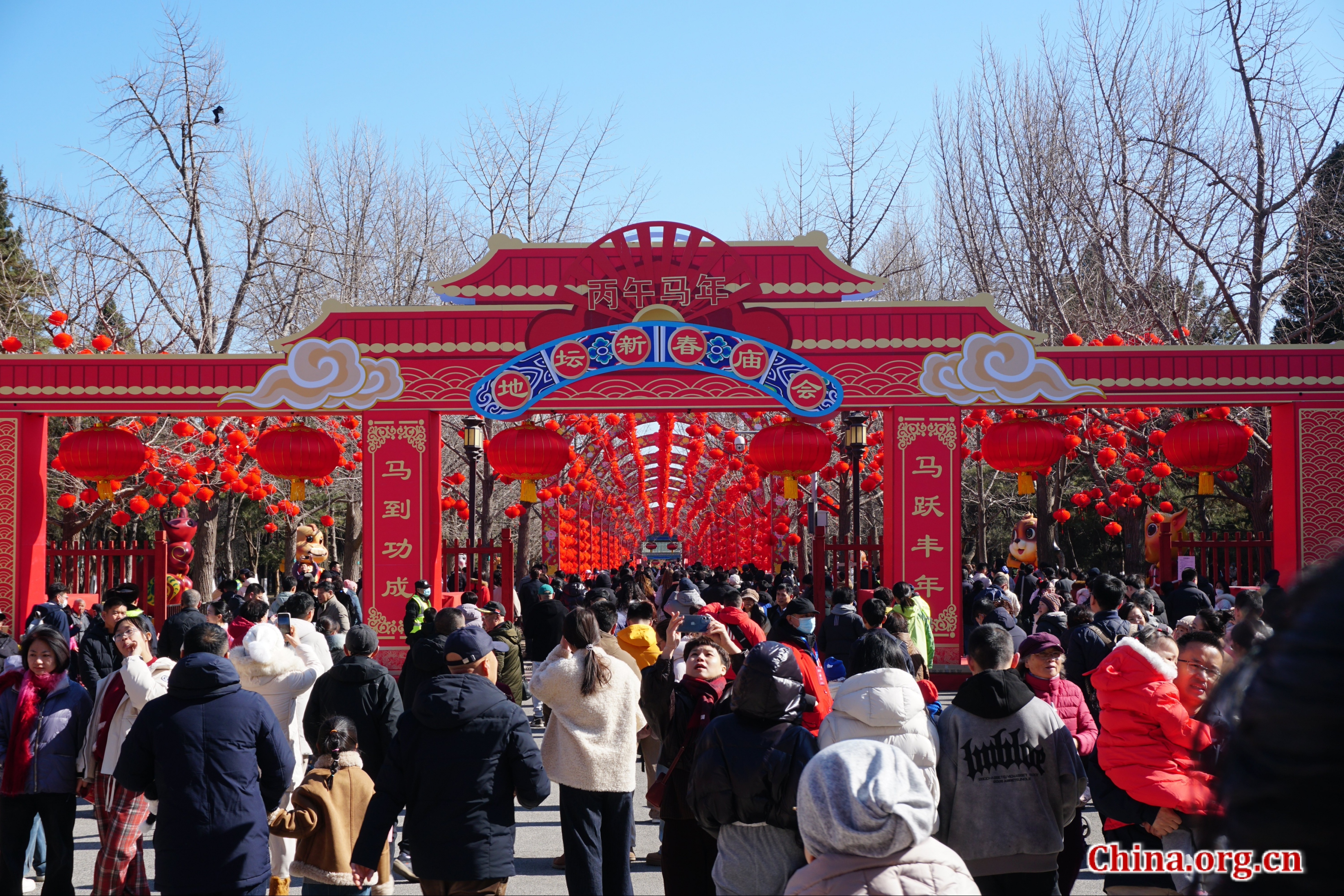 Visitors pass through the archway installation at the west gate of Ditan Park during the 38th Ditan Park Temple Fair in Beijing, Feb. 17, 2026. [Photo by Li Congrong/China.org.cn]