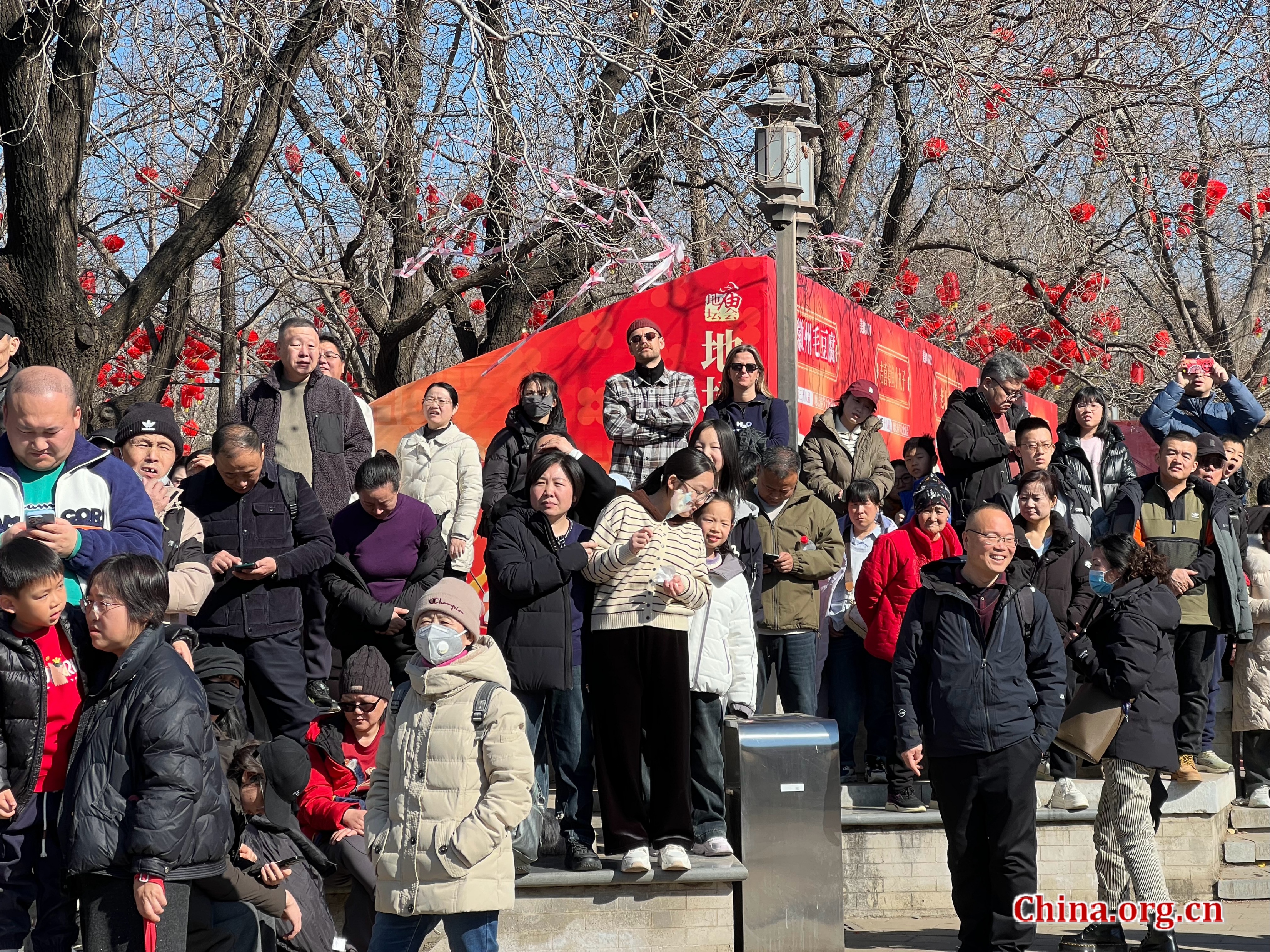 Visitors gather to watch song and dance performances at the 38th Ditan Park Temple Fair in Beijing, Feb. 17, 2026. [Photo by Li Congrong/China.org.cn]