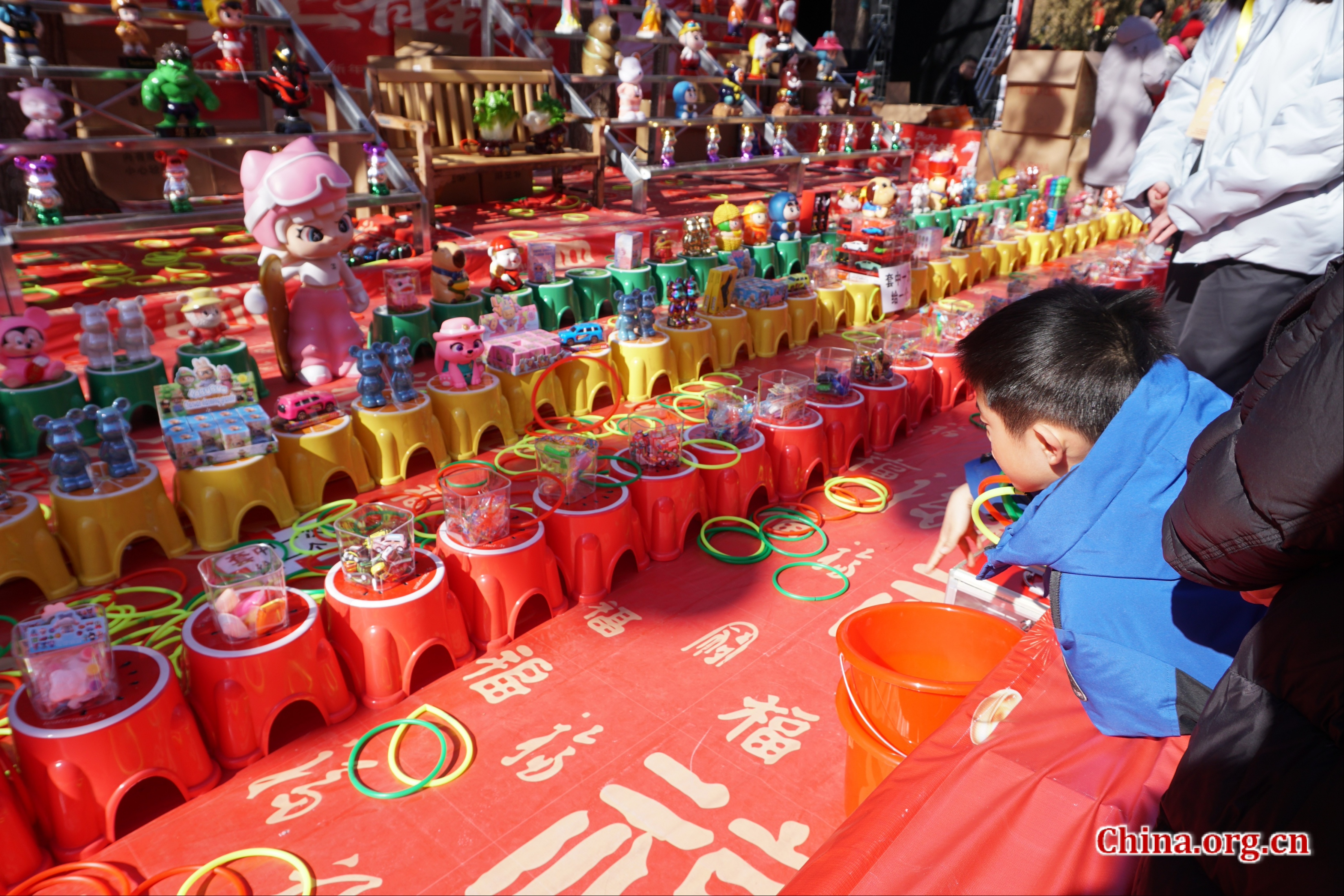 A boy tries to win a prize at a ring toss game at the 38th Ditan Park Temple Fair in Beijing, Feb. 17, 2026. [Photo by Li Congrong/China.org.cn]