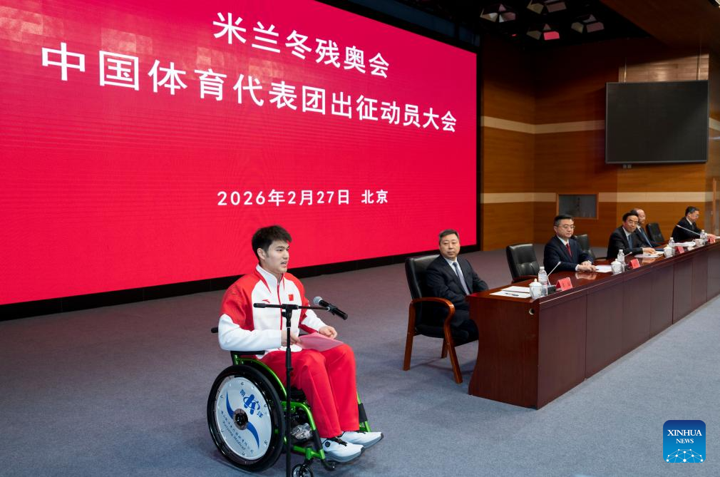 Para ice hockey athlete Wang Zhidong of China delivers a speech during the launch ceremony of Chinese delegation for the upcoming Milan-Cortina 2026 Paralympic Winter Games in Beijing, China, Feb. 27, 2026. The Games will take place March 6-15, with 79 medal events across six sports. (Xinhua/Cai Yang)