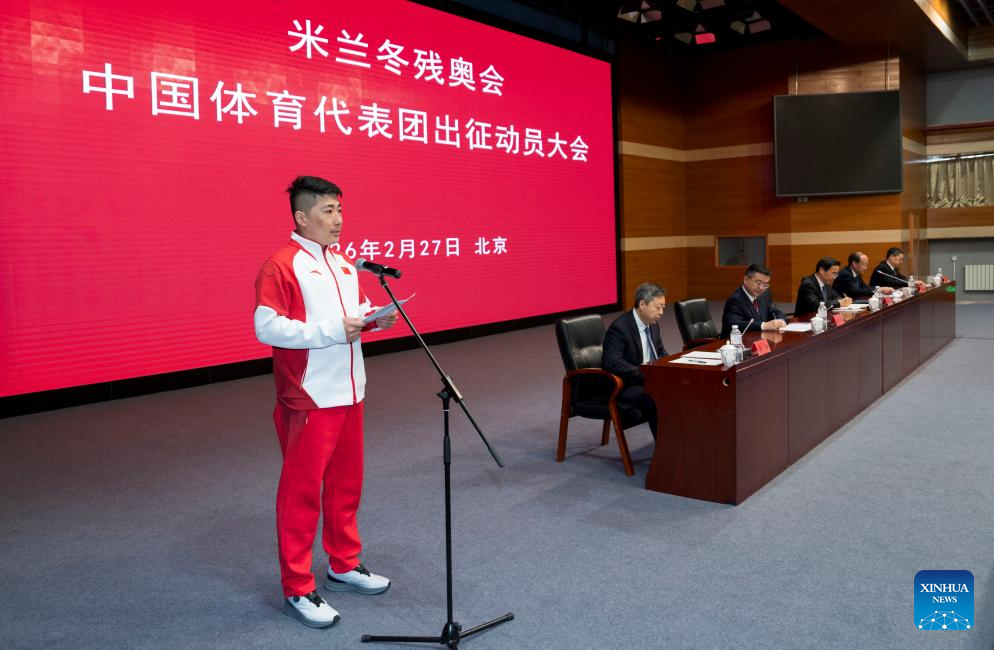 Snowboard coach Liu Song delivers a speech during the launch ceremony of Chinese delegation for the upcoming Milan-Cortina 2026 Paralympic Winter Games in Beijing, China, Feb. 27, 2026. The Games will take place March 6-15, with 79 medal events across six sports. (Xinhua/Cai Yang)