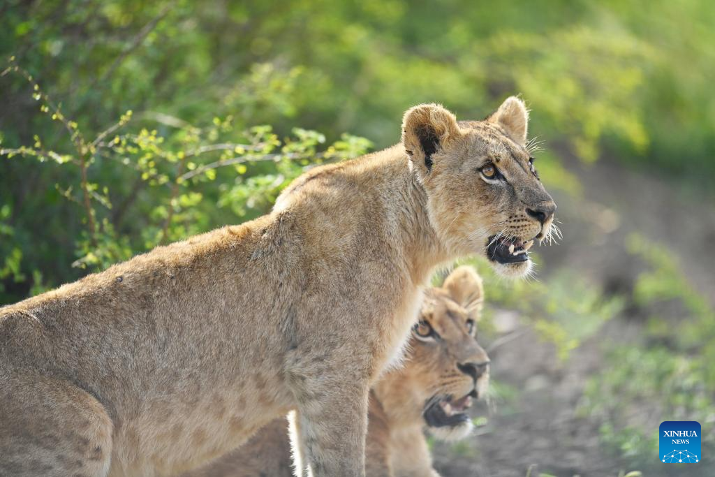 This photo taken on Feb. 26, 2026 shows two lions at the Nairobi National Park in Kenya. The Nairobi National Park is one of the few capital-based reserves in the world. Spanning 117 square kilometers of savannah, forests, and wetlands dotted with valleys and seasonal lakes, the park shelters over 100 mammal species and 400 bird varieties. (Xinhua/Liu Qiong)