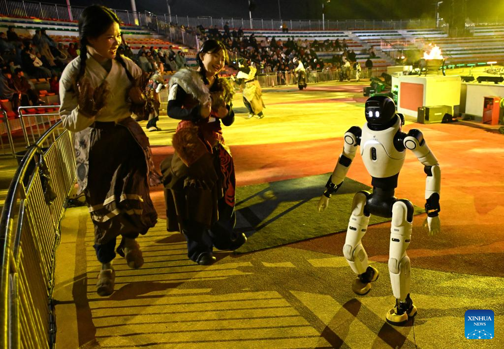 A humanoid robot performs during a myth-themed live-action show at a scenic area in Qingdao, east China's Shandong Province, on Feb. 26, 2026. (Xinhua/Li Ziheng)