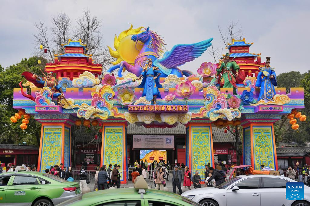 People visit a temple fair at Wuhou Shrine in Chengdu, southwest China's Sichuan Province, Feb. 27, 2026. The temple fair is held here to mark the ongoing Spring Festival, or the Chinese New Year, which will end on the 15th day of the first lunar month. (Xinhua/Liu Kun)