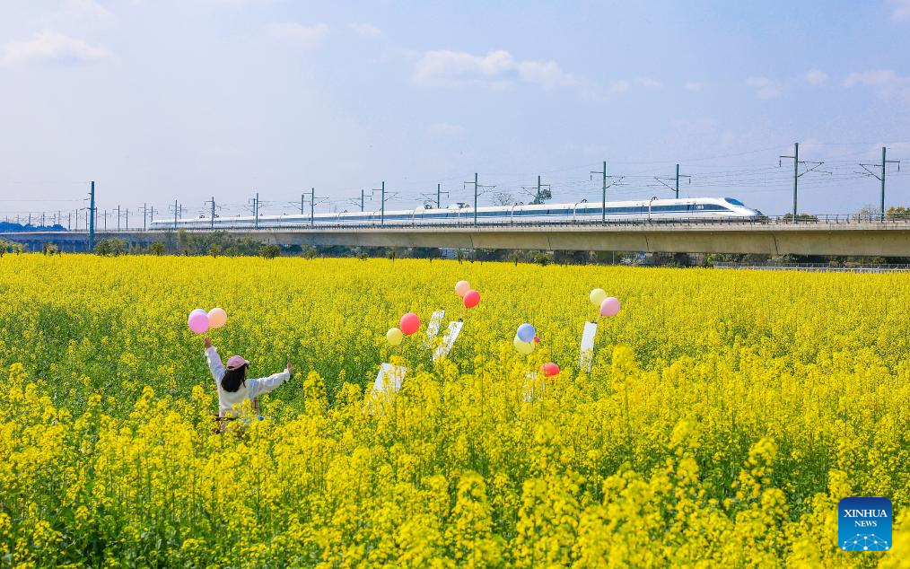 A tourist visits a rapeseed flower field as a high-speed train runs past in Longmatan District of Luzhou, southwest China's Sichuan province, on Feb. 26, 2026. (Photo by Mou Ke/Xinhua)