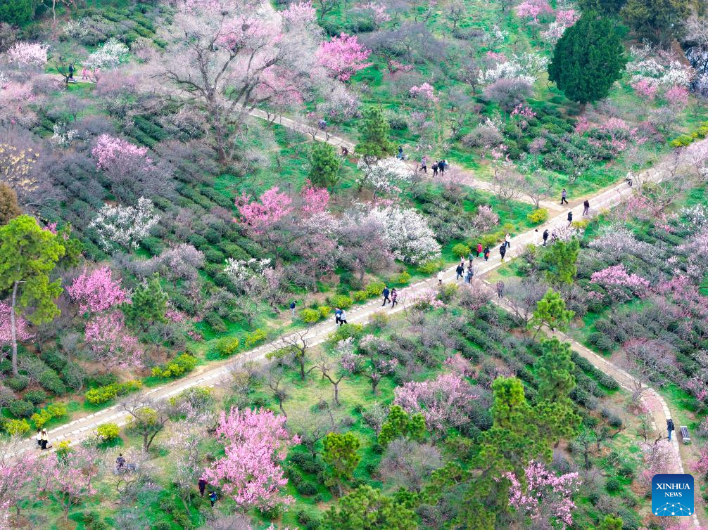 An aerial drone photo taken on Feb. 25, 2026 shows tourists visiting the Meihua Mountain at the imperial Xiaoling Mausoleum scenic area of Nanjing, east China's Jiangsu province. (Photo by Yang Suping/Xinhua)