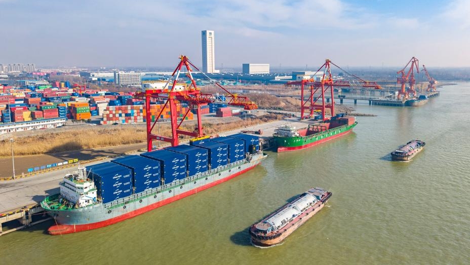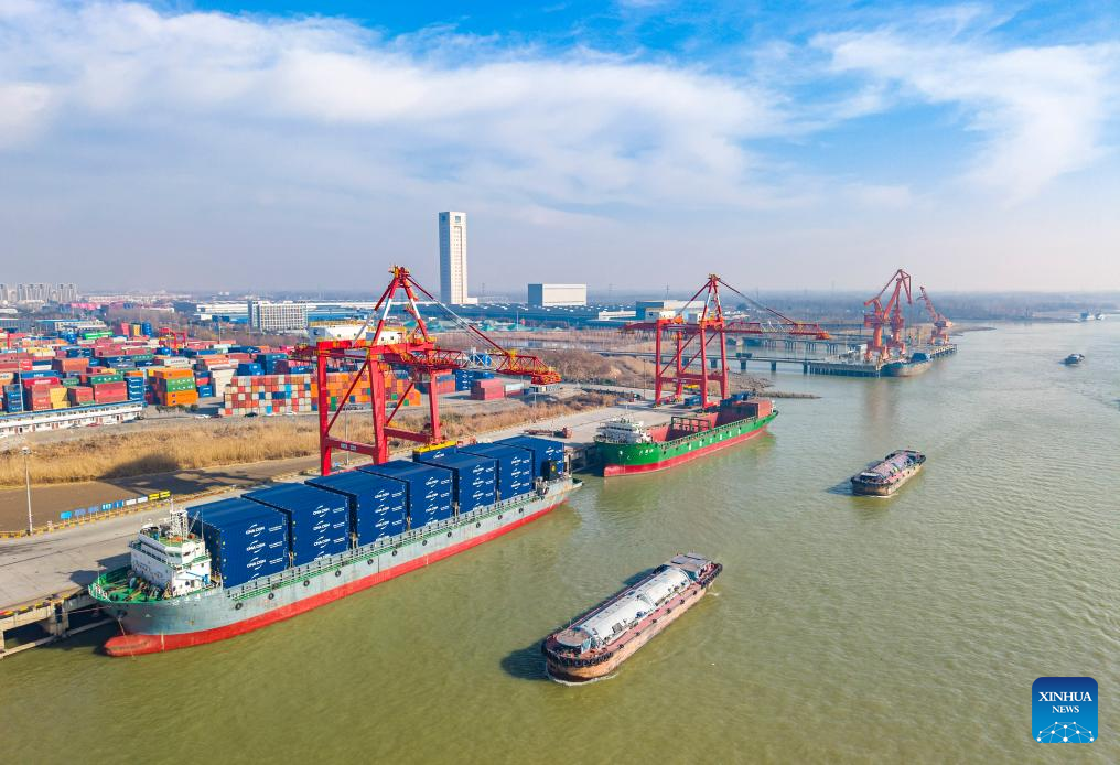 An aerial drone photo taken on Jan. 14, 2026, shows the Yangzhou Port in Yangzhou, eastern China's Jiangsu province. [Photo/Xinhua]