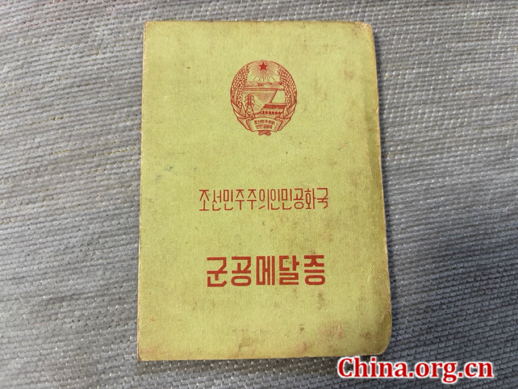 Photo taken Feb. 17, 2026, shows the Military Merit Certificate awarded to Yu Zelun by the Democratic People's Republic of Korea. [Photo by Yang Chuanli/China.org.cn]