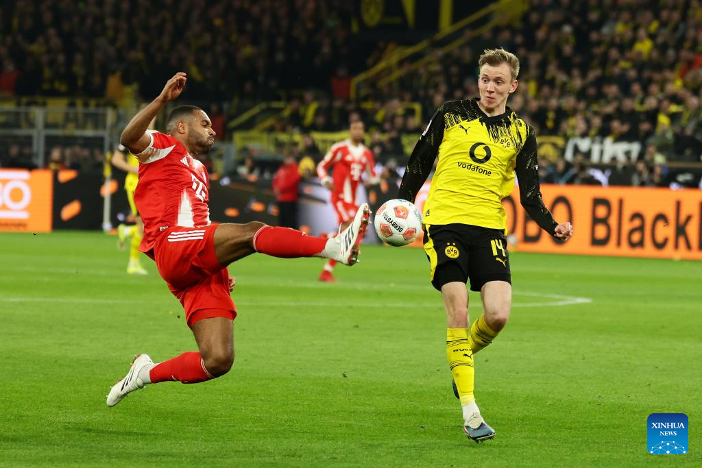 Jonathan Tah (L) of FC Bayern Munich vies with Maximilian Beier of Borussia Dortmund during the German first division Bundesliga football match between FC Bayern Munich and Borussia Dortmund in Dortmund, Germany, Feb. 28, 2026. (Photo by Joachim Bywaletz/Xinhua)