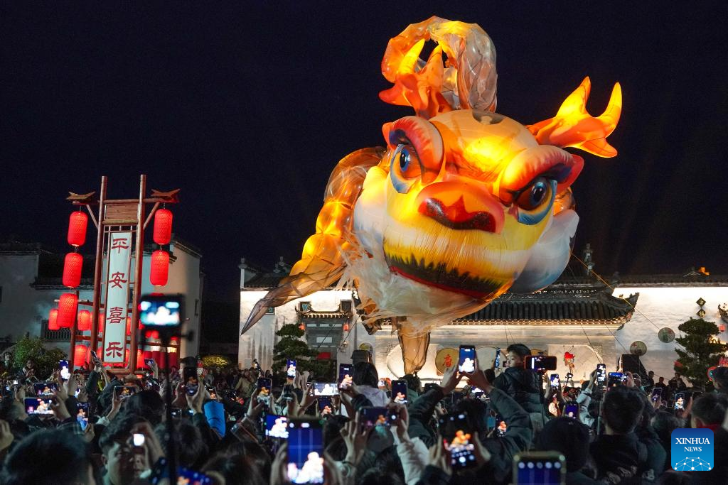 People watch an Ao Fish lantern parade at the Tangmo ancient town in Huangshan City, east China's Anhui Province, Feb. 27, 2026. The lantern parade was held here in celebration of the upcoming Lantern Festival on Friday, featuring the Ao Fish, a mythical Chinese creature with a dragon's head and a fish's body. (Xinhua/Du Yu)