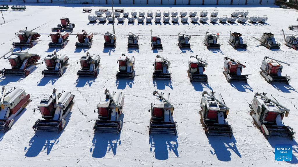 An aerial drone photo taken on Feb. 28, 2026 shows agricultural machines at Youyi Farm Co., Ltd. under Beidahuang Group in Shuangyashan City, northeast China's Heilongjiang Province. Heilongjiang Province, dubbed "grain barn" of China, has entered a new farming season. In Shuangyashan City, staff members are engaged in clearing snow and securing plastic coverings for greenhouses for paddy rice seedling breeding. Maintenance and inspection of agricultural machinery are also underway. (Xinhua/Wang Song)