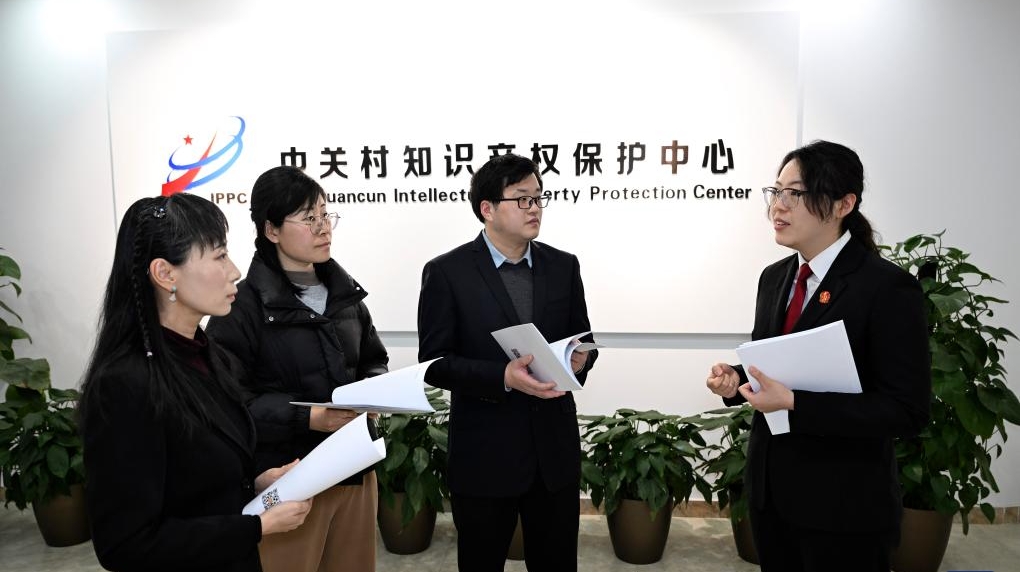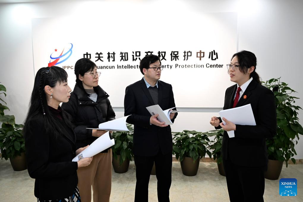 A judge with the People's Court of Haidian District of Beijing talks with staff members of Zhongguancun Intellectual Property Protection Center in Beijing, capital of China, March 7, 2025. [Photo/Xinhua]