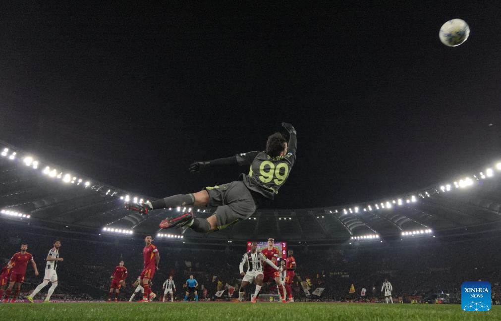 Roma's goalkeeper Mile Svilar (front) fails to save the goal of Juventus' Francisco Coincencao during an Italian Serie A football match between Roma and Juventus in Rome, Italy, March 1, 2026. (Photo by Alberto Lingria/Xinhua)