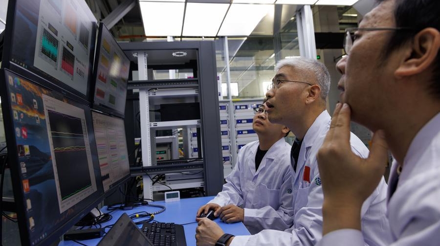 Researchers Li Gang, Liu Jianghua, and Zhou Benzhe (R-L) discuss the operational status of the all-superconducting magnet at the ultra-low temperature high magnetic field quantum oscillation experimental station of the Institute of Physics of the Chinese Academy of Sciences in Beijing, capital of China, on Jan. 26, 2026. [Photo/Xinhua]