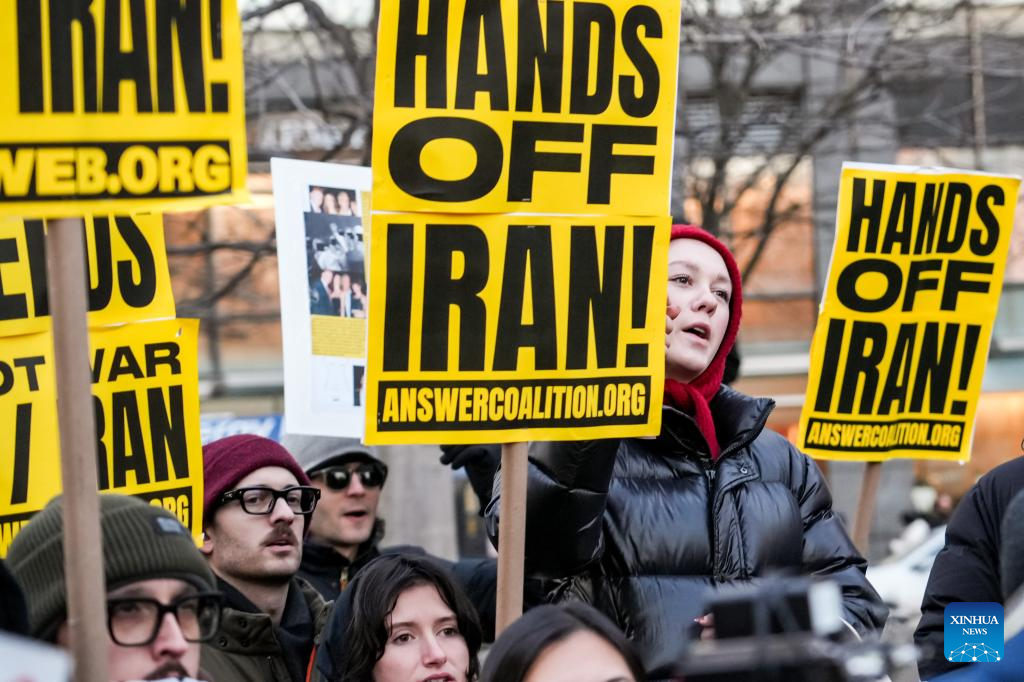 People protest against U.S. military attack on Iran in New York, the United States, on March 2, 2026. [Photo/Xinhua]
