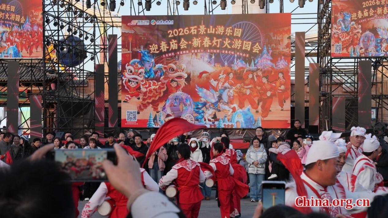 People watch the Ansai waist drum dance performance, a form of intangible cultural heritage, in celebration of the Lantern Festival at Shijingshan Amusement Park, Beijing, March 3, 2026. [Photo by ZhangYuxin]