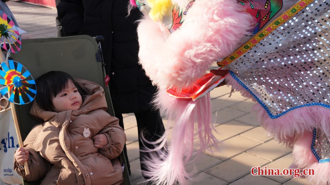 A playful lion dancer interacts with children watching the performance during the celebration of the Lantern Festival at Shijingshan Amusement Park, Beijing, March 3, 2026. [Photo by ZhangYuxin]