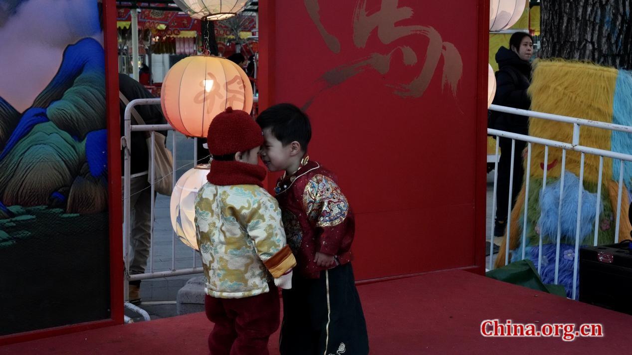 Two young children play—perhaps reenacting performances they recently watched—in front of a festive lantern installation celebrating the Lantern Festival at Shijingshan Amusement Park in Beijing, March 3, 2026. [Photo by Zhang Yuxin]